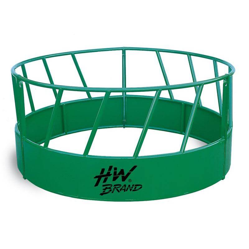 This style of bale feeder features flexibility for all types of calves, feeder cattle and breeding stock. Revolutionary FLEX FEEDER allows feeder to move as hay is consumed. As the bale or loaf becomes smaller, feeder will move to the bale. This feeder will perform equally for small calves or large bulls. Constructed of 1 3/4 ” 16 gauge high tensile tubing with solid 16 gauge skirted bottom. Drop pin and loop connections. Diagonal cross sections. Feeding area allows hinges to provide this unique flex feature. The four piece feeder is for Standard Round Bales and is 8′ in diameter in assembled shape. It can be 12 feet long when fully flexed. Height of feeder is 50″. Powder Coated HW Brand Green.
