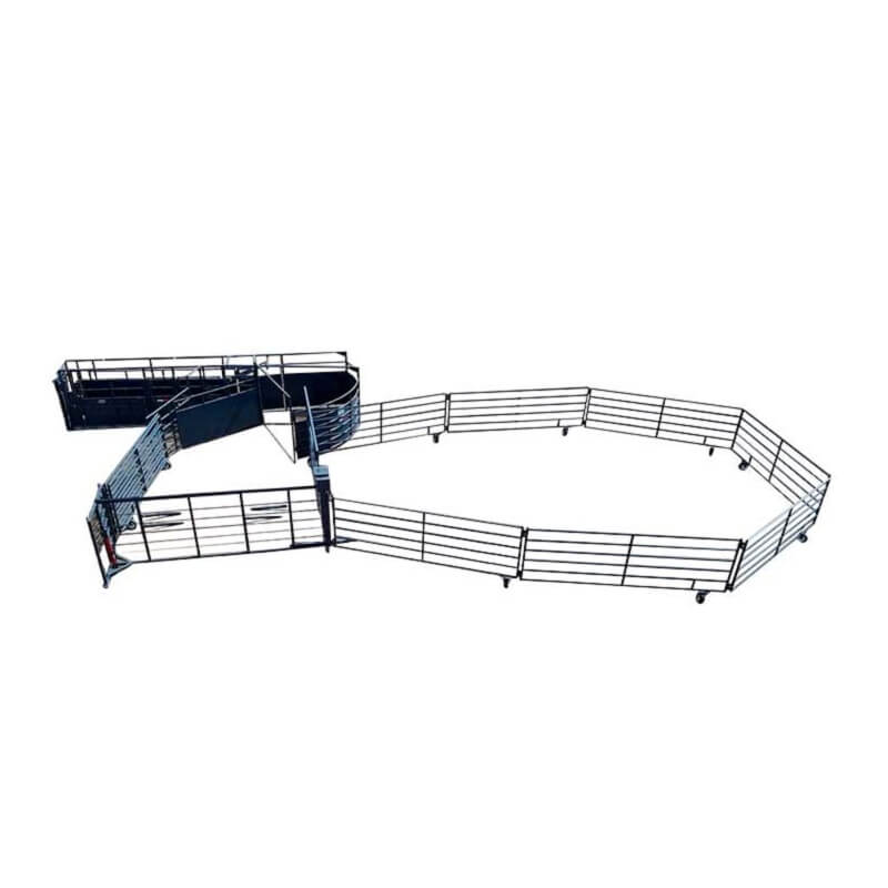 The Linn Post & Pipe Bulldog Wrangler Corral with bumper hitch holds up to 40 cows. This corral is a smaller, easy to fold out, and more affordable portable corral that can be used on its own or in tandem with a portable working system or corral to add more capacity and pen options.