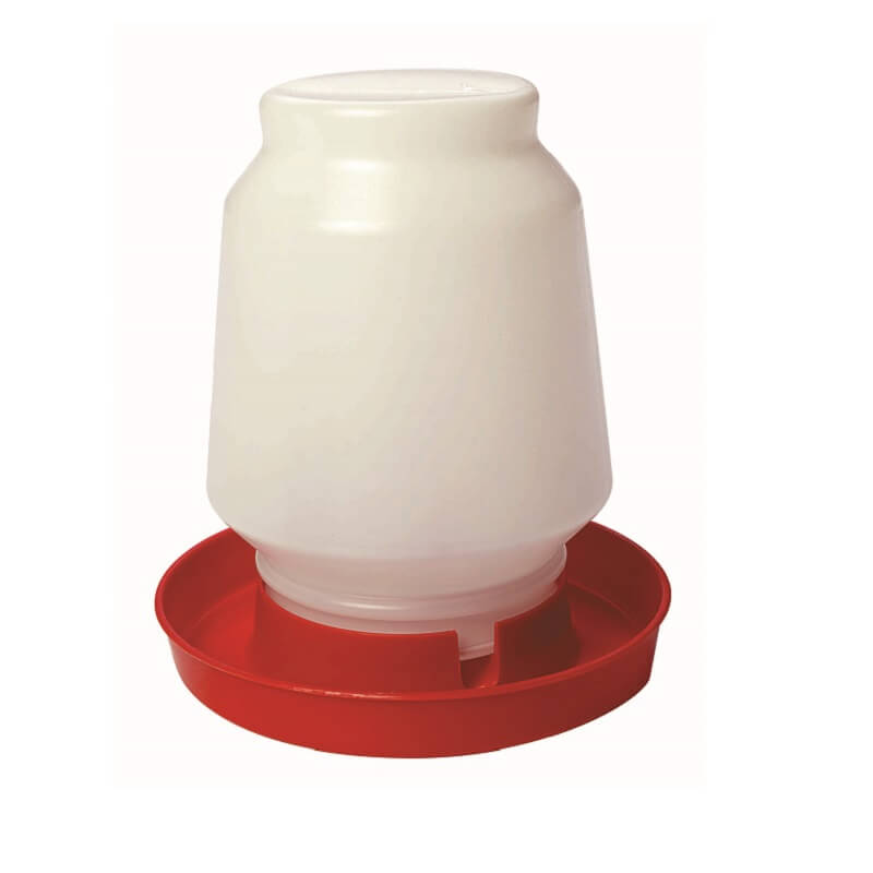 Complete gravity-feed poultry waterer with 1-gallon capacity. Jar is molded from durable transparent polyethylene so the water level is always visible. Base is heavy-duty polystyrene. Easy-fill screw-on design. Jar and base are also sold individually. 9 inch diameter by 10.25 inch high.
