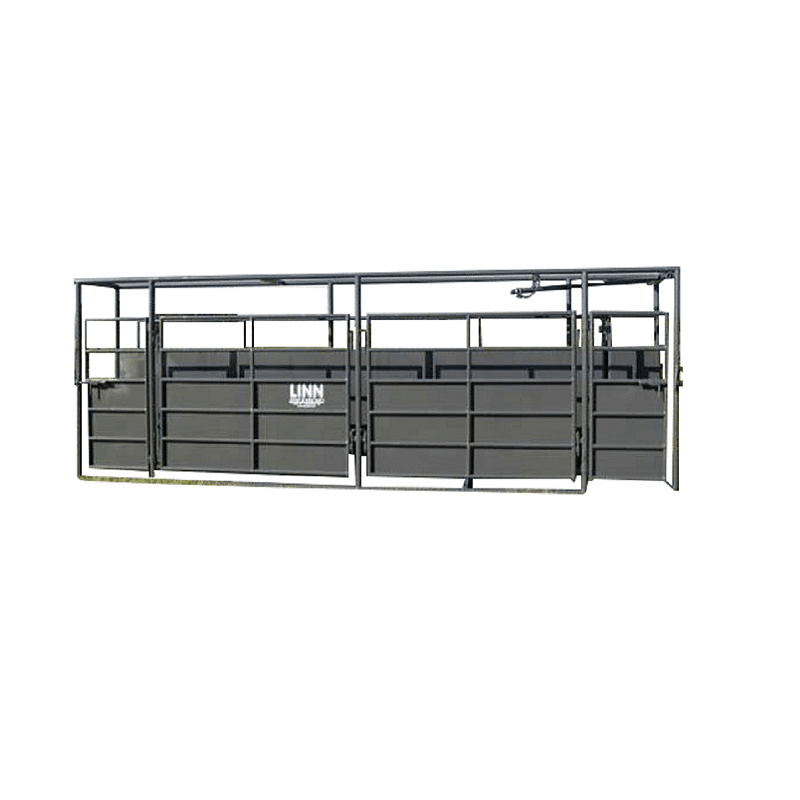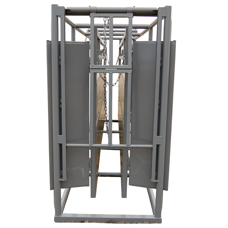 All steel, heavy and rugged one piece construction is durable and versatile. Vertical sides adjust in to 12″ and out to 30″. Both sides adjust to keep animal centered to working chute and are easy for animal movement to eliminate climbing.