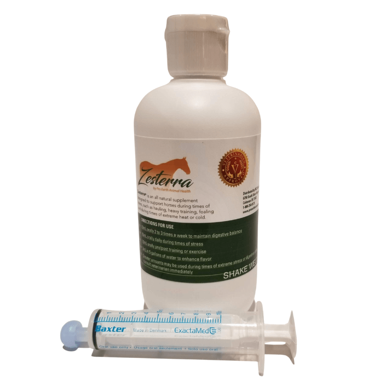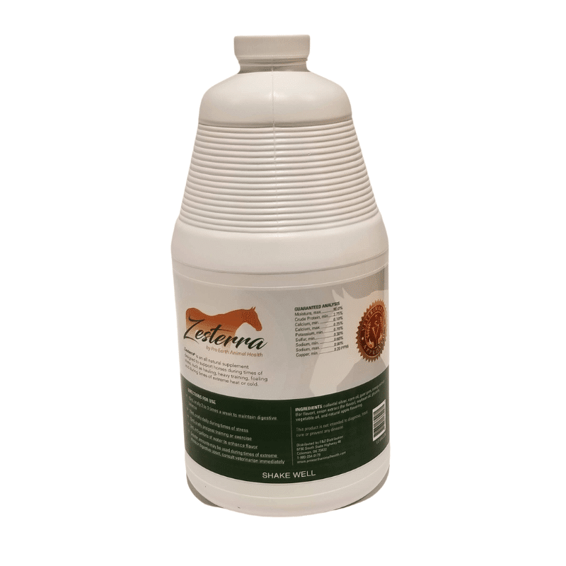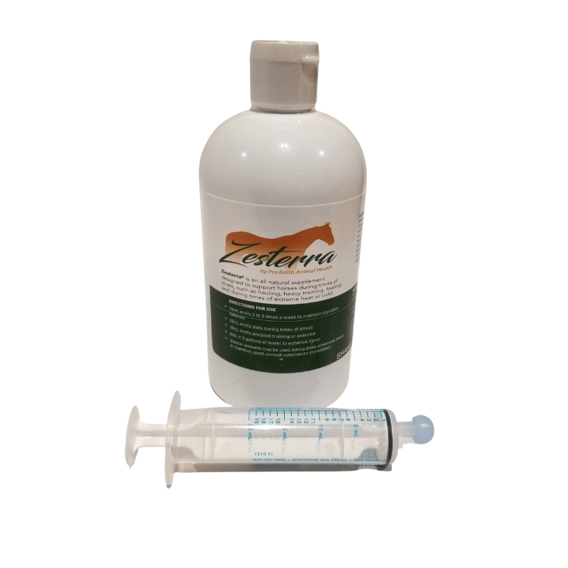 Pro Earth Zesterra® is an all-natural supplement designed to support horses during times of stress including hauling, heavy training, foaling, and extreme heat or cold. It’s safe for all classes of horses including lactating mares and foals. It stimulated appetite and water consumption by balancing the pH part of the stomach.
