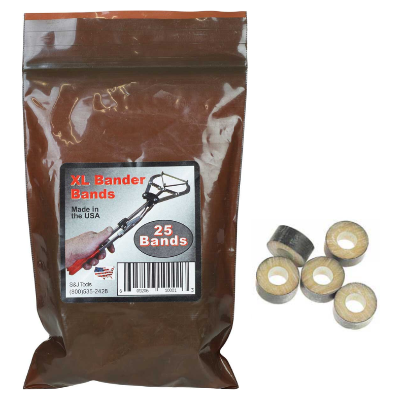 The S&J Tools XL Bander Bands can open to 4″ x 3″ x 3″ and are designed to be used with the Wadsworth XL Castrating Bander. The flat sides prevent bands from rolling off the applicator. For bulls weighing from 250 to 650 lbs. 25 per bag.