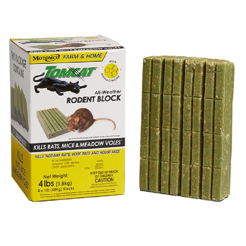 Tomcat All-Weather Rodent Blocks by Motomco Ltd. are a proven, popular way to control rats and mice. They provide economical control using the active ingredient Diphacinone, a multiple feed anticoagulant that has delivered proven results for more than 25 years. Each box contains 4 individually wrapped 1lb bars of bait and can be used indoors and outdoors.